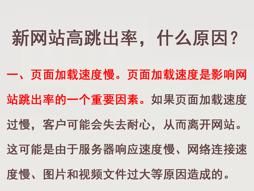 頁面加載速度是影響網站跳出率的一個重要因素。如果頁面加載速度過慢,客戶可能會失去耐心,從而離開網站。這可能是由于服務器響應速度慢、網絡連接速度慢、圖片和視頻文件過大等原因造成的。