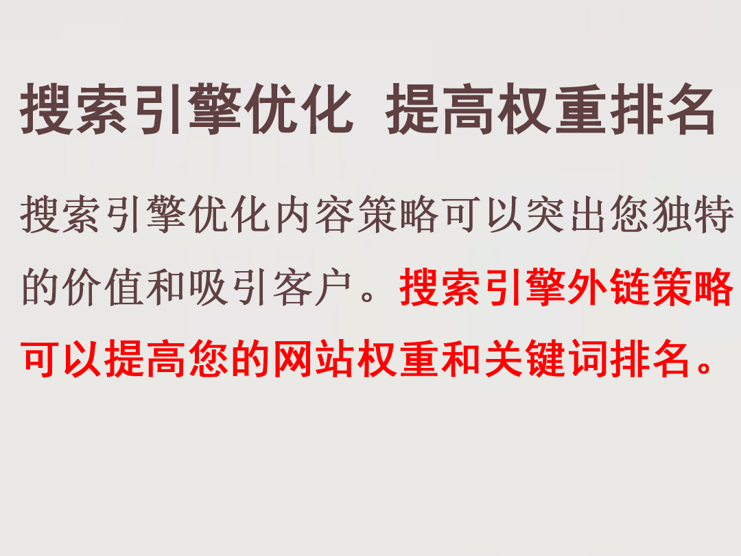 SEO搜索引擎優化推廣企業網站權重和網站關鍵詞排名。搜索引擎優化內容策略可以突出您獨特的價值和吸引客戶。搜索引擎外鏈策略可以提高您的網站權重和關鍵詞排名。如果您做了搜索引擎優化(SEO),您就可以快速推廣自己網站。