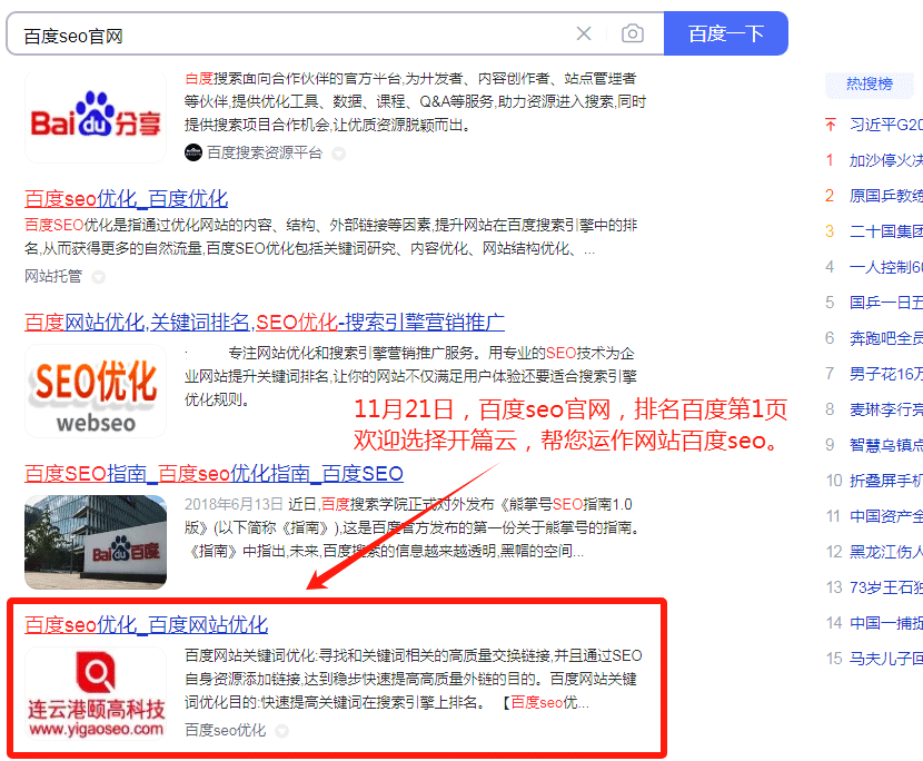 2024年11月21日,開篇云旗下網站百度seo官網排名第一頁